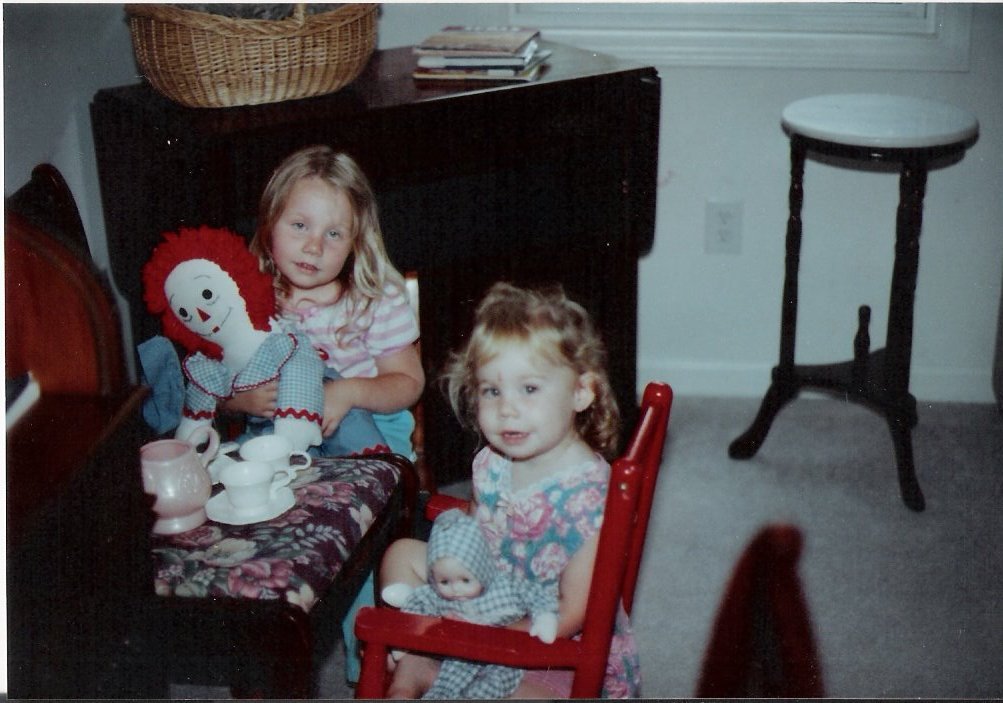 Me (holding Raggedy Andy) having a tea party with my sister.